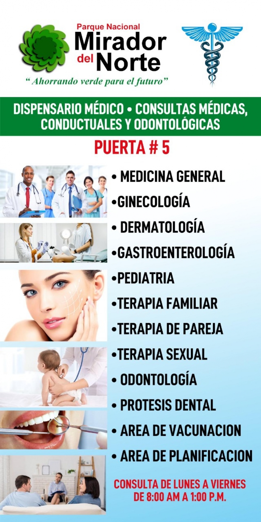 El Parque Nacional Mirador del Norte tiene como objetivo claro y preciso ayudar a la comunidad y es por eso que existe un centro de salud y odontología lo cuales funcionan de lunes a viernes a favor de todos. El dispensario médico ofrece los siguientes servicios a un costo asequibles y de buena calidad para toda la familia. -MEDICINA GENERAL -GINECOLOGIA -DERMATOLOGIA -GASTROENTEROLOGIA -PEDIATRIA -TERAPIA FAMILIAR -TERAPIA DE PAREJA -TERAPIA SEXUAL -ODONTOLOGIA -PROTESIS DENTAL -AREA DE VACUNACION -AREA DE PLANIFICACION Te invitamos a que nos visites, estamos ubicado en la puerta No.5 Para más información, por favor llamar al 809-926-9022 Ext: 2223-2228-2232.